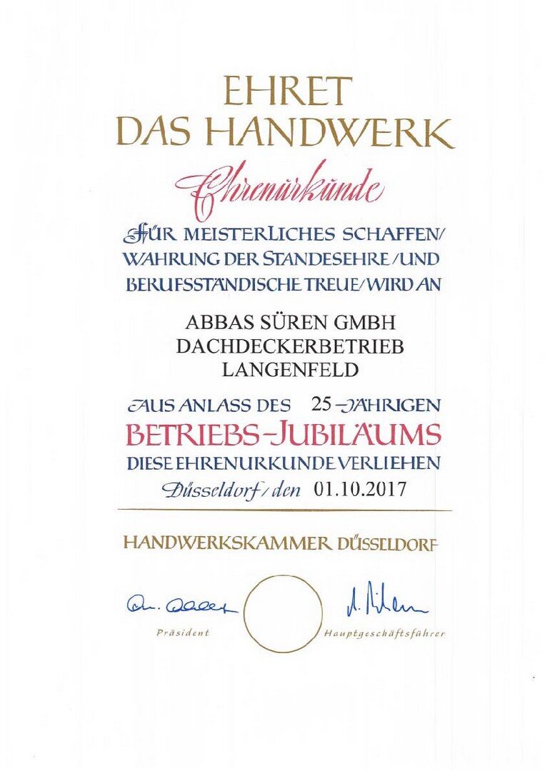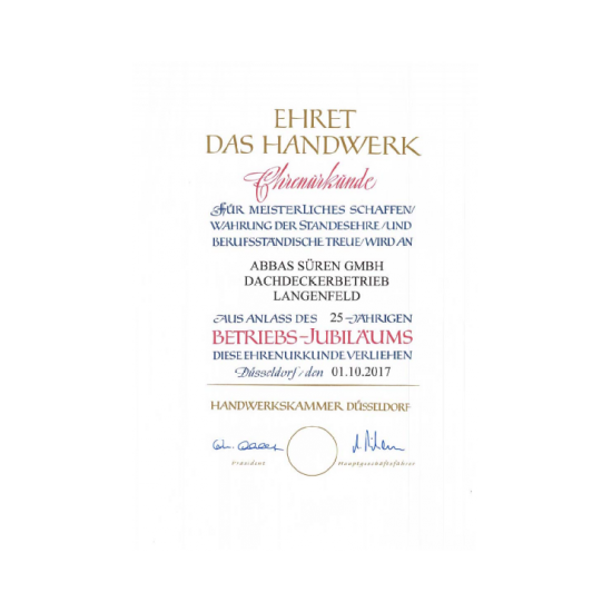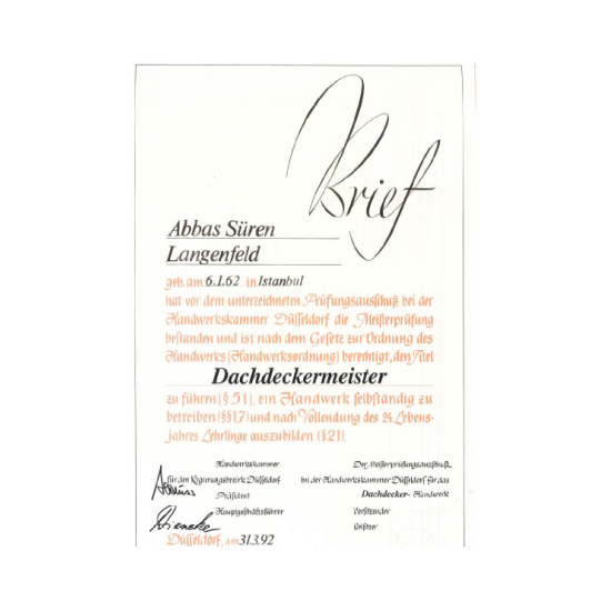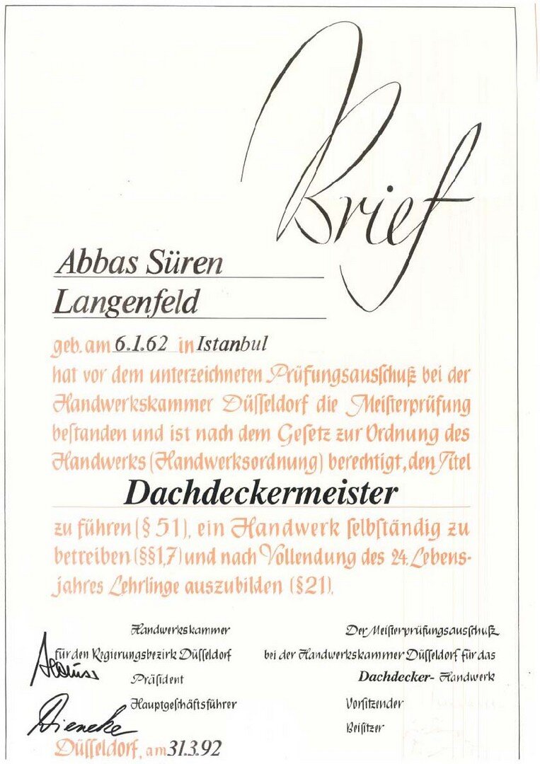 Unser Unternehmen "Abbas Süren Bedachungen" wurde am 01.10.1992 in Langenfeld gegründet. Seit dem 01.09.1999 sind wir in der Betriebsstätte Industriestraße 82 in Langenfeld ansässig.